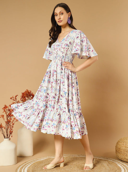 Experience the beauty of our Bluish Flowers Match with Peach V-Neck Midi Dress, featuring a stunning floral print and elegant V-neck design.