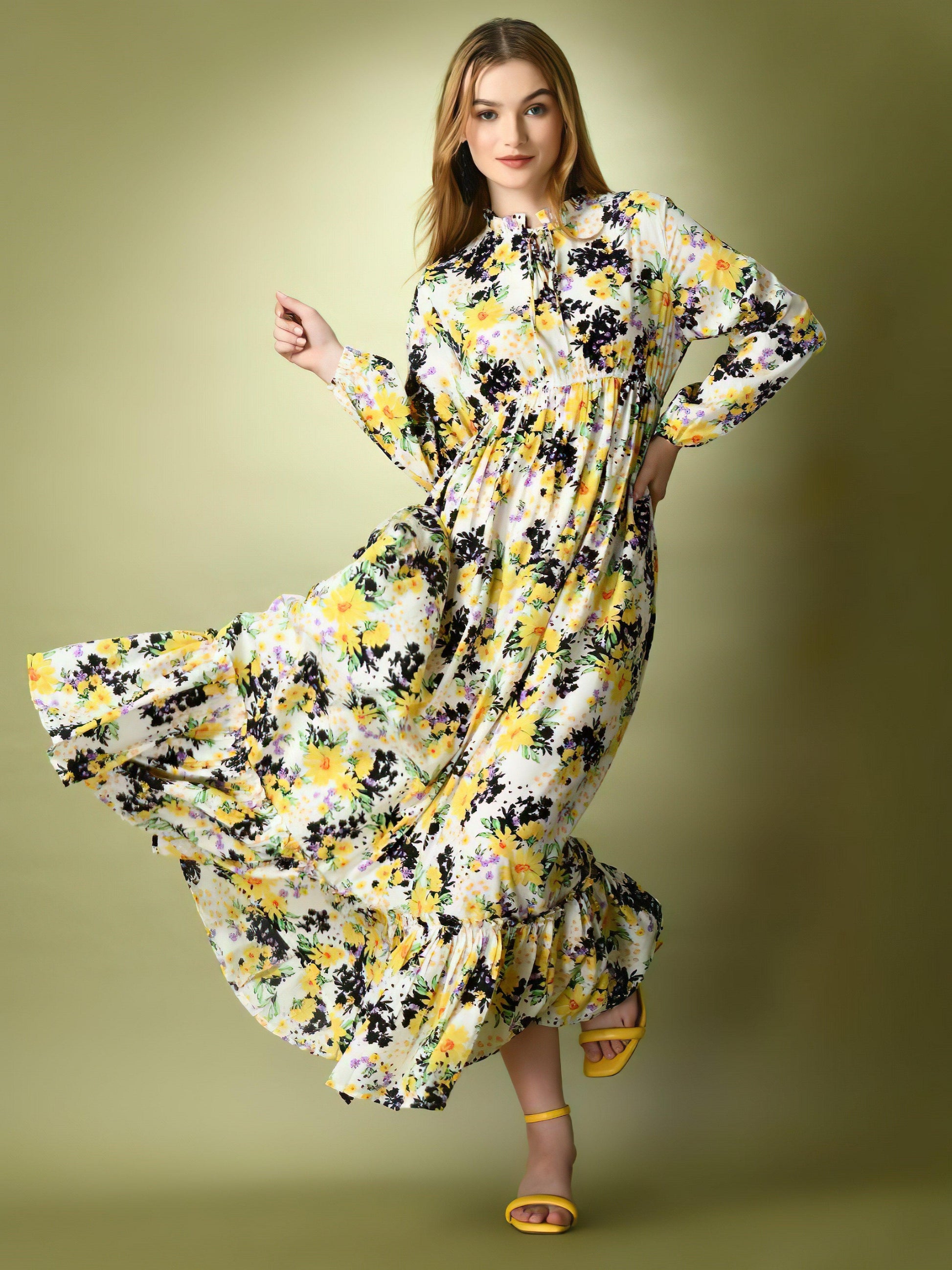 This Yellow Flowery Long Dress is a beautiful and versatile wardrobe essential. With its vibrant yellow color and delicate floral design, it's perfect for any occasion. Made from high-quality materials, this dress is not only stylish, but also comfortable to wear. Add it to your collection and elevate your style game effortlessly.
